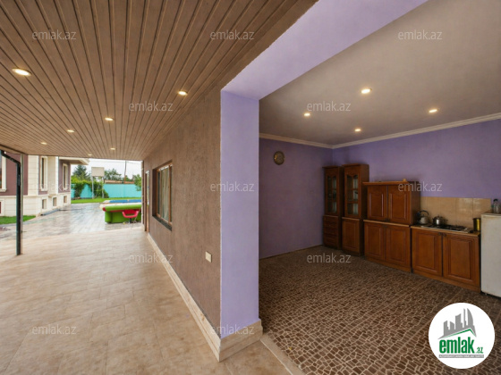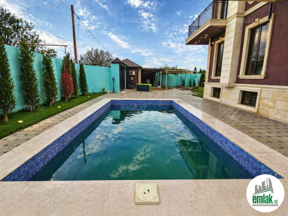 Həyət və əlavə imkanlar: Filtr sistemi ilə təchiz olunmuş geniş hovuz, manqal otağı, yay mətbəxi, yardımçı bina və mühafizəçi otağı mövcuddur. Həyətdə müxtəlif növ meyvə və dekorativ ağaclar əkilib, tam landşaft işləri görülüb.