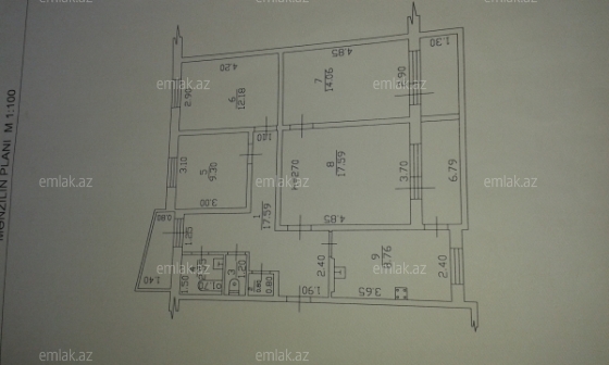 Mənzilin otaqlarının ikisi ic-icədir, ikisi isə ayrı-ayrıdır. Hamamla tualet ayrı-ayrıdır. Otaqların sahəsi ; 17.59 m2; 14.06 m2; 12.18 m2 ; 9.3 m2. Mətbəxin sahəsi 8.76 m2-dir.