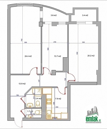 2 otaqdan 3 otağa düzəlmə (studiya plan)