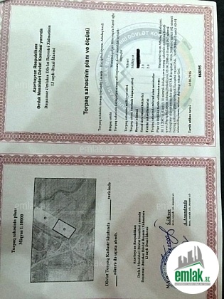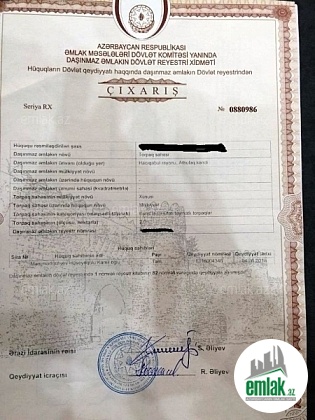 Daşınmaz əmlakın Dövlət reyestr xidmetinden çıxarışdır (kupça). Təyinat əkincilik ve təsarüfat ücün nəzərdə tutulur. Hissə hissədə bölünüb satılır.