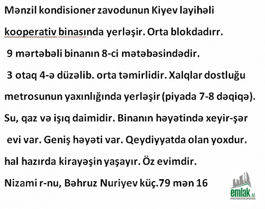 3 otaq 4-ə düzəlib. orta təmirlidir. Xalqlar dostluğu