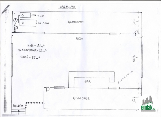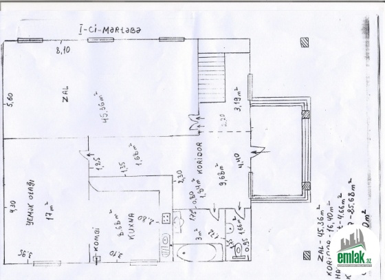 Birinci mertebede - gonag otagi(45.36 m2),metbex(8.68 m2),yemek otagi(17m2),hamam (3m2), tualet(1.66m2) ve 1 kladovka(3.19m2) var.