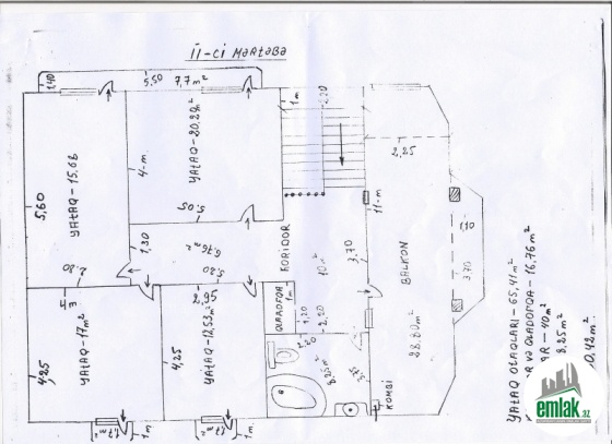 Ikinci mertebede - 4 otag,hamam-tualet (8.25m2) ve boyuk shkaf(koridorda) var.Butun otaglarda balkon var ve 2-ci mertebenin umumi genish balkonu(28.80m2.) var