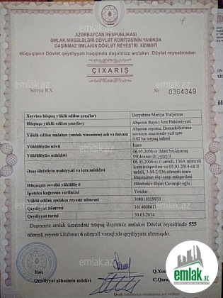 Abşeron rayonu Saray qəsəbəsində. 1) Torpaq sahəsinin kateqoriyası(məqsədli təyinatı) - Yaşayış məntəqələrinin torpaqları. 2) Torpaq sahəsinin mülkiyyət növü- Xüsusi. Daşınmaz əmlakın dövlət reyesterində qeydiyyata al...