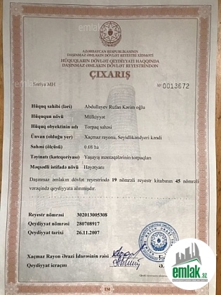 Salam əziz müştərilər Torpag öz torpagimdir boş və istifadə etmədiyim üçün satiram o ərazidə heç kəsin nə bələdyədən nə də başqa bir əsasli sənədi yoxdur sadəcə abonent kodlari alan adamın adina keçəcək qaz yoxdur onuda ...