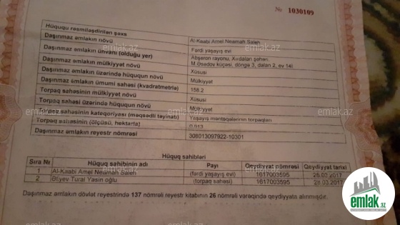Xırdalan şəhərində Bazarsotre Marketin yaxınlıqında 1.3 sotda 2 mərtəbəli 5 otaqlı əşyalı tam mülkiyyət bütün sənədləri qaydasinda (həyətin də torpaqin da Çıxarışı var) olan həyət evi təcili olaraq satılır. Ev 2 mərtəbədir hər bir mərtəbənin girişi ayrıdır. hər iki mərtəbənin ayrıca sanitar qovşaqı və ayrıca mətbəxti var. hər iki mətbəxtin mətbəxt mebeli var. 1-ci mərtəbədə Holl, Zal, Yataq otaqı, s/q (bütün əşyaları ilə. 2-ci mərtəbə Holl, Zal, 2-yataq otaqı, Mətbəxt, s/q və tam əşyaları ilə birgə. Həyətə maşın salmaq üçün ayrıca jalüz qapı var. Həyət səliqəlidir və tametdir. Evdə Kombi sistemi Kombi və radiatorları var. Şəkillər evə aiddir. Ətraflı məlumat üçün buyurub əlaqə saxlaya bilərsiz.