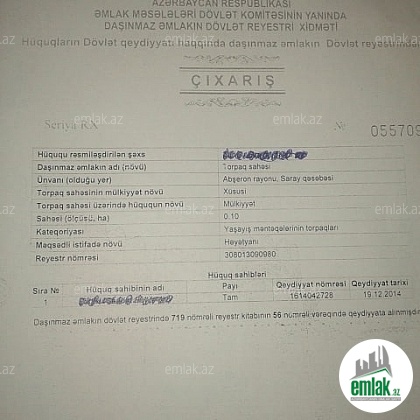 Saray Masazir yolunda yerləşən 10 sot torpaq sahəmi satiram. Fərdi ev tikintisi üçündür. Kupçası var.Yoldan 150 metr məsafədədir. 1 sotu 8000 manatdir. 1,5 sotdan başlayaraq ..istədiyiniz qədər bölünə bilər. Bütün kamunal xətləri- Konalizasiya,işıq,su ,qaz ... var.