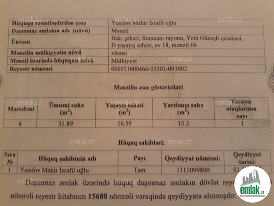 Mənzil şəxsi mülkiyyətdir, tək kupça və tək çıxarışla...