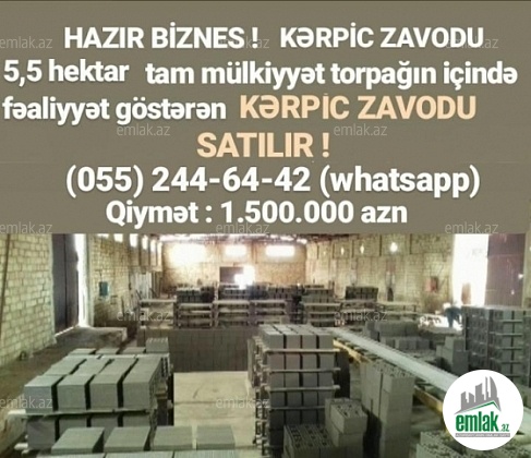 5'5 hektar mülkiyyət (çıxarışı var) torpağın içində fəaliyyətdə olan kerpic zavodu satılır. İstehsal gücü 10 000 kerpic bir növbəyə. Gil karxanasi 1.5 km məsafədə yerləşir.Hal-hazIrda işləyir.