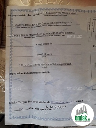 Samaxi rayonu , Mədrəsə kəndi ,Köhnə toyuq ferması , torpaq sahəsi satılır.Hasarlanib. Sahədə 50 ədəd qoz agaci var . Hər il məhsul verir . Həmçinin üzümçülük və digər kənd təsərrüfatı üçün idealdır.Torpaq sahəsində 0.50 ha tikinti,2.50 ha kənd təsərrüfatı üçün nəzərdə tutulmuşdur.Sənədləri var. Whatsapp var.