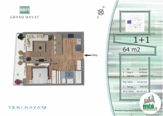 Grand Hayat Yaşayış Kompleksində 10-cu Binasında 27-i mərtəbəli Tikilinin 20-ci mərtəbəsində ümumi sahəsi 65 kv.m olan 2 otaq(1+1 studio) mənzil satılır.Binada demek olark, çox mənildə Yaşayış var.Alan təmir edib yaşaya bilər.Qaz,su,işıq var.Binada 6 Lİft mövcudur.İlkin ödəniş 55000AZN. 4il aylıq 960 Azn ödəmə ilə.Banka qalıq borc 45000AZN.Nəğd 100000 AZN. İpotek tək şəxsiyyət vəsiqəsi ilə adan ada keçrilir. DAHA ƏTRAFLI MƏLUMAT ÜÇÜN ZƏNG EDİN............