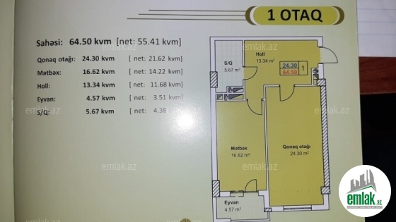 Xırdalanın mərkəzində, Heydər parkının yanında inşa edilmiş 16 mərtəbəli binanın 5-ci mərtəbəsində yerləşən ,ümumi sahəsi 64 kv/m olan təmirsiz 1 otaqlı mənzil satılır.(müxtəlif mərtəbələrdə də var) 2 otağa düzəliş etmək olar. İstəsəniz mənzilləri daxili kredit şərti ilə (banksız) əldə edə bilərsiniz.Ümumi məbləğin 30 %-ni, qalan məbləği isə 24 ay (2 il) müddətinə ödəməklə mənzilə sahib olmaq mümkündür.Ümumi məbləğ 48.640 AZN.(1 kv/m x 760 AZN)...İlkin ödəniş ( 30 %) 14.592 AZN.Əyər ilkin ödənişinizdə və ya aylıq ödənişinizdə hər hansı çətinlik yaranarsa müəyyən qədər güzəşt mümkündür.Mənzillər əlavə heç bir sənəd tələb olunmadan, tək şəxsiyyət vəsiqəsi ilə sənədləşdirilir.İlkin ödənişi çox etdiyiniz halda qiymətdə endirim mümkündür.Mənzillər ipotekaya yararlidir.İstəsəz mənzili qısa müddətdə təmir edə bilərik.Material və işçi haqqı daxil 10.000 AZN-ə.Qiymətdə dəyişiklik etmək şərti ilə mənzilləri 12, 18, 24 aya kimi kreditlə təmir edə bilərik.