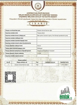 Suraxanı rayonu Yeni Günəşli qəsəbəsində havası təmiz, dənizə gözəl panoramalı yerdə 4 sot torpaq sahəsi satılır. Torpağın yolu asfaltdır və dörd bir yanında evlər var. Tam sənədli Kupçalı (Çıxarışlı) torpaqdır. Ev tikməyədə icazəsi var. Bütün kommunal xəttlər, telefon xətti torpağın düz yanındadır. İşıq xətti çəkilib sayğacda qoyulub. Şəxsi torpağımdı. Maklerlər narahat etməsin. Real alıcı ilə razılaşma olacaq.