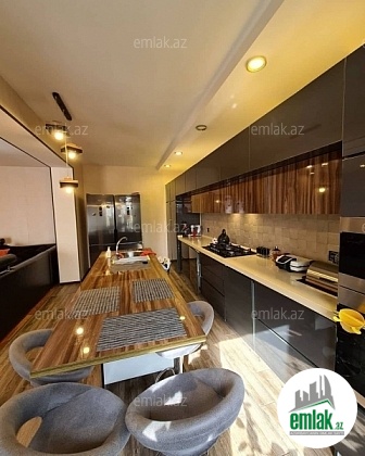 Açıq eyvanı var.Baseyn,manqal,terast cam balkon.Mətbəx mebeli daxil.