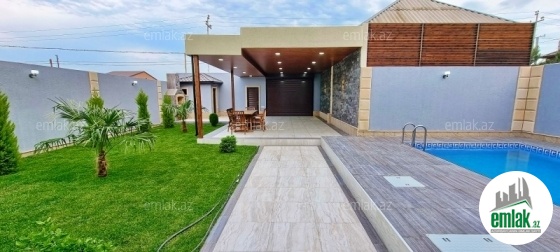 **RUFAT*AYNUR** Merdekan qes, Merlin salonu ve İBO markete yaxin 4 sotda modern üslubda yeni inşa edilmiş 1 mərtəbəli 4 otaqlı bag evi satılır, 140 kv.m, 1 qonaq, 3 yataq otağı, 2 san/q, istilik sistemi kombi, qaz, icməli su xətti, işıq, həyətində filtirli hovuz, besedka, manqal, jalyuz darvaza, su ambarı, isti döşəmə. Yolu asvalt, cıxarış (kupca)