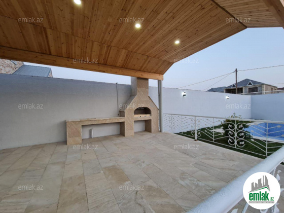 Açıq eyvanı var.Baseyn,manqal,terast cam balkon.Mətbəx mebeli daxil.