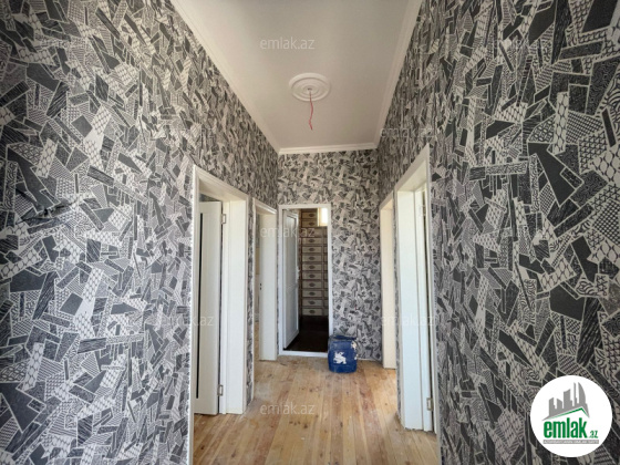 Sənədi çıxarış (kupça). 1.7 sotun içindədir. Evin sahəsi 90 kv. 3 otaqlı, tam təmirlidir. Altı qarajlıdır, qoşa daşla tikilib. Su, qaz, işıq çəkilib, sayğacları quraşdırılıb. İstilik sistemi kombidir.