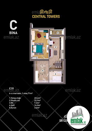 Yasamal rayonu, Mərkəzi Park yaxınlığında yerləşən Central Towers yaşayış kompleksinin 7-ci mərtəbəsində ümumi sahəsi 71 kvadrat metr olan 1 otaqlı təmirsiz mənzil satılır.