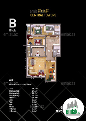 Yasamal rayonu, Mərkəzi Park yaxınlığında yerləşən Central Towers yaşayış kompleksinin 4-cü mərtəbəsində ümumi sahəsi 187 kvadrat metr olan 4 otaqlı təmirsiz mənzil satılır.