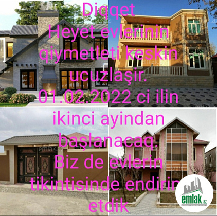 Heyet evlerinin keskin ucuzlaşmasi sebeblerinden biz de tikinti şirketi olaraq qiymetleri endirdik. Aldiqimiz melumatlara göre 01.02.2022 ci ilin ikinci ayindan ucuzlaşmalar özünü görsedecek. Bizim de qiymetlerimiz ense bele keyfiyet cox yüksek olacaq. Evlerinizin tikintisini bizlere hevale etseniz peşman olmarsiniz.