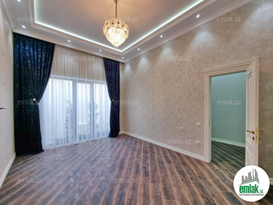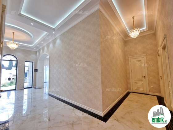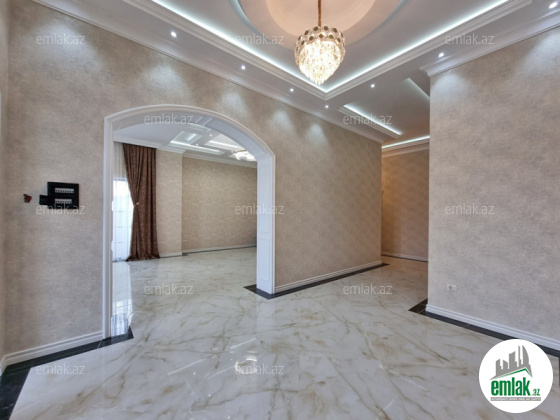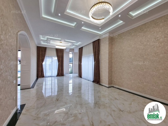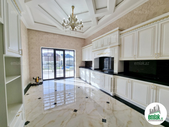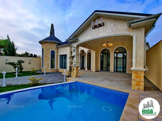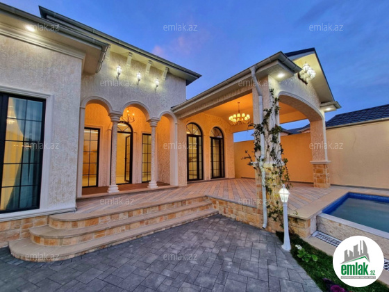 **RUFAT*AYNUR** Merdekan qes. Merlin salonunun yaxınlığında yerləşən toskano üslubunda yeni inşa edilmiş 1 mərtəbəli yaşanmamış bag evi satılır, 6.5 sot, 200 kv.m, 1 zal, 4 yataq otaği, dolab otağı, 2 san/qovşağı evin icində və 1 san/qovşağı həyətində yerləşir, ev tam isti döşemelidi, kombi istilik sistemi, hündür tavan 3.8m, mətbəxin qarşısında qeniş terras yerləşir, həmcinin manqal, daşma tipli filtirli hovuz, avto ücün yer, yer alti su ambarı, pultla idare olunan darvaza. İcməli su xətti cəkilib, qaz, işıq. Cıxarış (kupca). Bag yaşayiş massivinde yerleşir ve il boyunca yaşamaq ucun yararlidir. Yolu asvalt örtüklüdür.