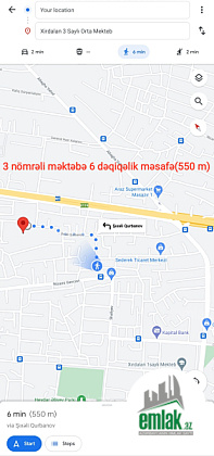 Ev Xırdalanın mərkəz hissəsində, avtobus dayanacağına 2 dəqiqəlik, məktəb, baxça, park, poliklinika və s. vacib nöqtələrə 5-10 dəqiqəlik məsafələrdə yerləşir.
