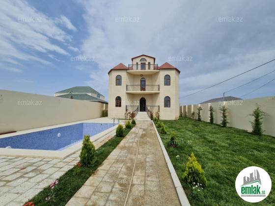 Merdekan qesebesinde 7 sotda insa edilmis 2 mertebe+mansard bag evi satilir.Umumi sahesi 360 kvmdir.5 otag-1 zal,3 yataq,mansardda 1 otag var.Evin tikintisində keyfiyyətli tikinti materiallarından istifadə edilmiş və çox səliqəli inşa edilmişdir. Heyetinde geniş filtirli hovuzu, bisetkasi , manqalnisi , dekorativ ve meyve aqaclari , qarajı, sensorla olan gece isiqlari, sanitar qovsaqi var.Qazi,suyu ve isigi daimidir.Sened Kupca