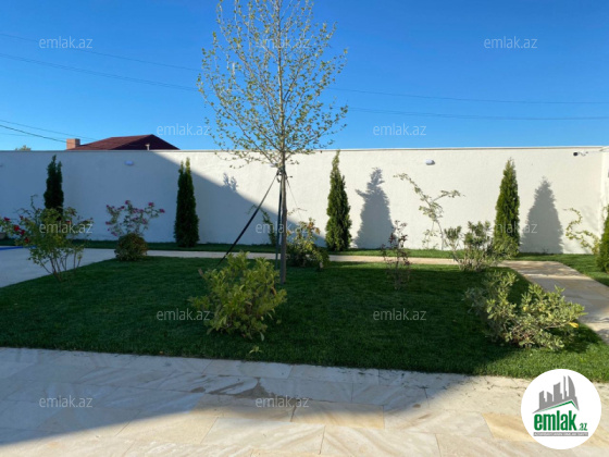 Həyətdə şam ağacları (tuya) və digər ağaclar və güllər, həmçinin qazon mövcuddur Filtrli hovuz (12,5*4,5). Qaz, su və işəq daimidir. Yolu asfaltdır. Siqnalizasiya sistemi mövcuddur və 24 saat kamera sistemi işləyir. Darvaza pultnan avtomatik. Çıxarış mövcuddur.