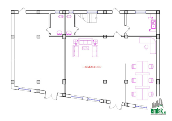 Bir hissəsi: 1 ci mərtəbənin bir tərəfində böyük zal “şou rum”, mətbəx və sanitar qovşağı var