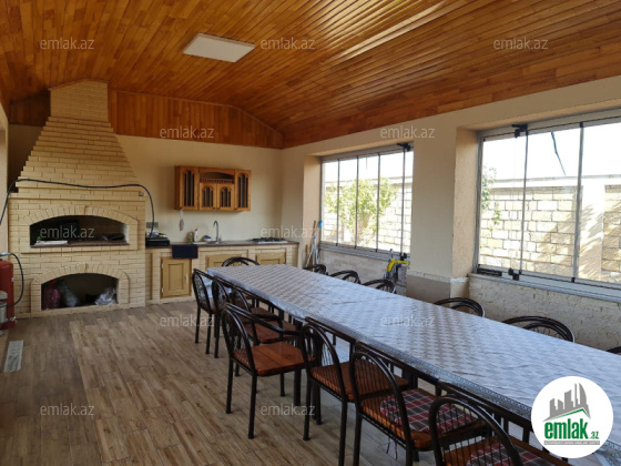 Salam.28.5 sotda 2 mertebeli tam təchiz olunmuş(mebeller,mühafizə polisi),qaraj,hovuz(16m uzunluğu-5.50 eni)hem qapalı,hem açıq olur.300 növ ağac(ekseriyyeti meyve),qış mətbəxi(hem qapalı olur,həm açıq)həyətda 2 otaqlı mətbəxli oxran otaqı var,2 elavə su ceni qaraj altı-50 t ev üçün,80 t ağaclar üçün.İçməli su daimidir.Bağın qabağında 1 sot ıçəri elave maşinlarin saxlanilmasi üçün yer var.heyet 1.50 m qazilib yerine daha münbit torpaq tökülüb.Bir sözlə əsl bağ evi,otaqların şəkillərini elave etmirem.Evde 4 sanuzel var