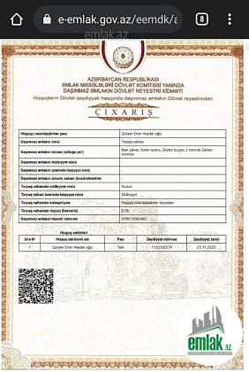 Ziq sossesi(avtoban),hava limaninnan weher istiqametine gelende,Naxcivanski herbi litseye catmamis,yolun saqinda(Zeytun baqlarinda) 3 sot cixarisli torpaq sahesi ve elave olaraq 100kv yaxin temirli hazir tikilisi olan(tikili qaraj kimi istifade ucun tikilib,ancaq isteye gore ev kimide temir istifade etmek olar) erazi satilir,Tikilinin pultnan jaluzi,3 fazali iwiqi ve icinde temirli hamam tualeti var.elave olaraq evin tikintisine Xetai r.icra hakimiyyetinnen serenvam alinib,evin tikintisi ucun butun planirovka isleri gorulub,fundamenti atilib,layihesi cekilib...Cox sakit bir erazidi,gozel havasi ve denize menzeresi var.Elave melumat ucun zeng ede bilersiniz.