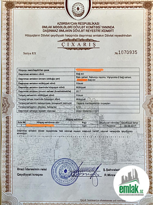 Salam Mərdəkanda bağlar massivində prestijli yerdə 19 sot bağ torpaq sahəsi satılır torpaq 19 sotdu kupçada 14 sot qeyd olunub qapıya qədər asvaltdı dənizə 10 dəqiqə məsafə var
