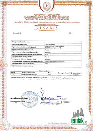 Tam təmirli 2 mərtəbə, cüt daş, 5 otaq, 1 mətbəx, 2 sanitar qovşaq, qaz, su, işıq, 2 sanzuel kombi və hər tərəfdən kamera ilə təchiz olunub.