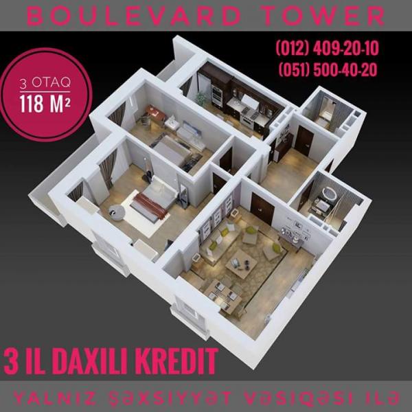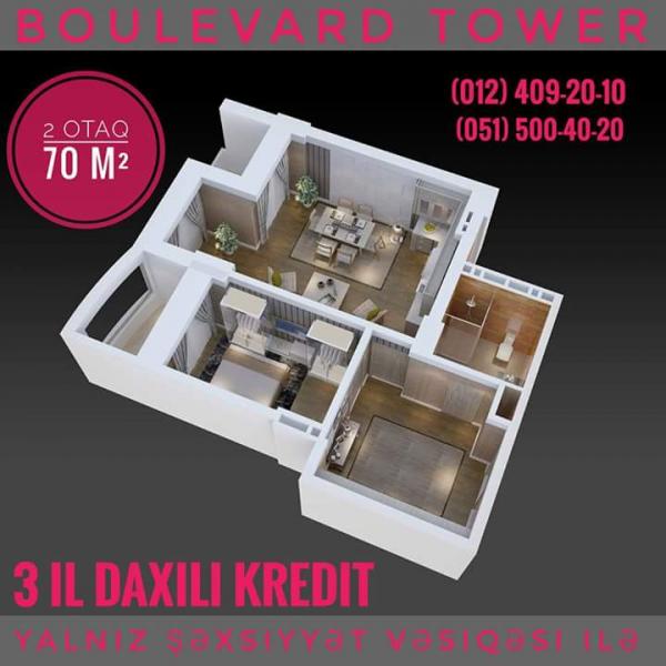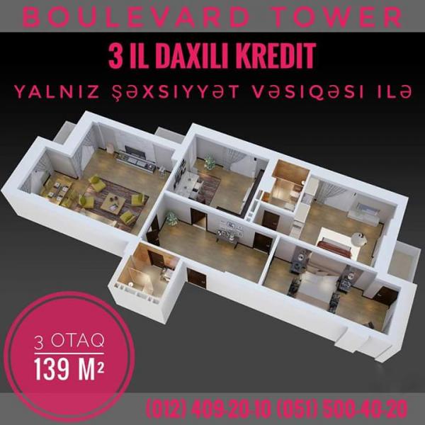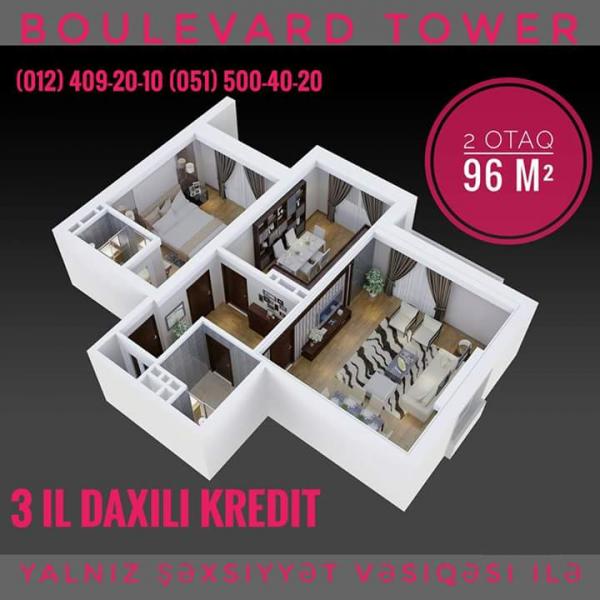 "BOULEVARD TOWER" - элитный 3-х блочный жилой комплекс премиум-класса, рядом со станцией метро "Хатаи". 1, 2, 3, 4 и 5-ти комнатные квартиры, паркинг на 100 автомобилей, закрытый двор, газ, охрана 24/7, расстояние до бульвара и до метро 150 м, прекрасная панорама на Каспий, детская площадка. ВНУТРЕННИЙ БЕЗПРОЦЕНТНЫЙ КРЕДИТ НА 3 года, с предоплатой 30%. Дата сдачи проекта - Декабрь 2018 года.