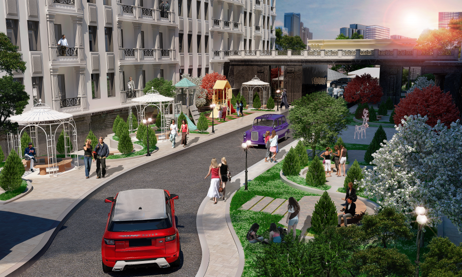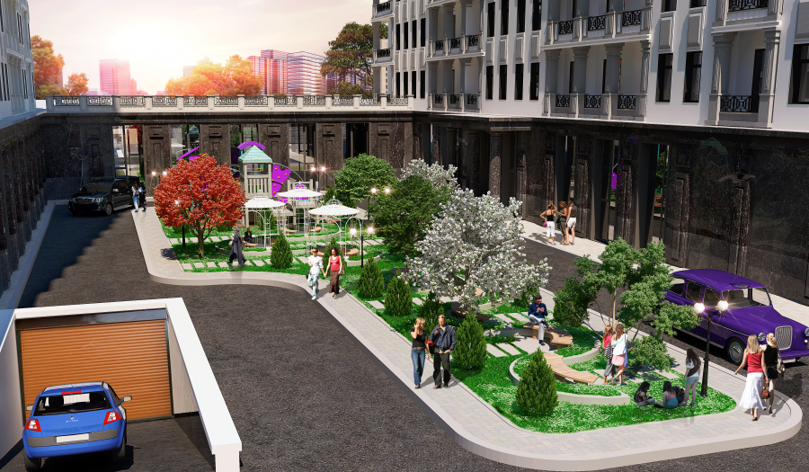 "Evim Residence" yaşayış kompleksinin ərazisi kənar şəxslər üçün bağlanıb, burada mühafizə xidməti fəaliyyət göstərəcək, videomüşahidə kameraları quraşdırılacaq. Kompleksin qapalı həyətyanı sahəsi 9 000 kv.m-dir. Korpuslar bir-birinə paralel yerləşir və bir-biri ilə örtülü qalereya ilə birləşdirilir. Evlərin arasında geniş asfalt avtomobil yolları və səki plitəsi ilə örtülü piyada yolları salınır. Layihə çərçivəsində məhəllənin ərazisinin landşaft dizaynı tətbiq ilə yaşıllaşdırılması nəzərdə tutulur, ağaclar və dekorativ bitkilər əkilir, qazonlar salınır. Daxili həyətdə müasir oyun trenajorları olan bir neçə uşaq meydançası tikilir. "Evim Residence" kompleksinin sakinləri üçün skamyalar ilə rahat çardaq quraşdırılır. Avtomobil və piyada yolları boyunca binaların xarici görünüşü ilə uyğun olan küçə fənərləri quraşdırılır. Yeni sakinlərin avtomobilləri üçün geniş yeraltı parkinq tikilir, qonaq nəqliyyatı üçün isə yerüstü dayanacaq nəzərdə tutulur. Evlərin birinci mərtəbələrində mağazalar, spa-salon, fitnes zalı fəaliyyət göstərəcəkdir. Bundan əlavə 24 nəfərlik kinoteatr, ad günlərinin keçirilməsi "party otağı" olacaq. Kompleksdə məktəb və uşaq bağçası da olacaqdır. Kompleksdə A binası otel tipli olacaq və sakinlərə bir çox xidmətlər göstəriləcək. Mənzillərin yığışdırılması, çantaların qaldırılması, avtomobillərin park edilməsi, taksi, restoran sifarişi və.s xidmətlər olacaq.